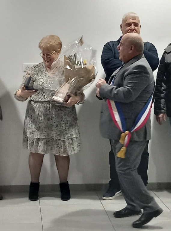 LE 8 MAI A L'ISSUE DE LA CÉRÉMONIE, MADAME MARIE CLAIRE PERRIN A ÉTÉ DECORÉE PAR MONSIEUR SCHWAB DE LA MÉDAILLE DE BRONZE ASSOCIATIVE DE LA LÉGION VOSGIENNE EN PRESENCE D'UNE BELLE ASSEMBLÉE, DE MONSIEUR LE MAIRE ET DE JEAN MARIE SON ÉPOUX PRÉCÉDEMMENT MÉDAILLÉ.